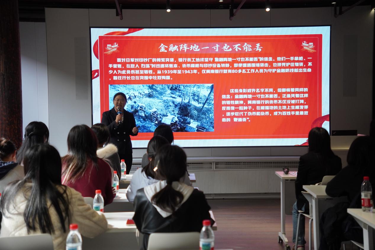 冀南银行——金融战线的“硬通货”:宣讲团成员千金重点讲述了冀南银行在抗战时期的英勇事迹。在日军经济封锁的背景下,冀南银行以“每发行1元货币,必有0.8元实物储备”的铁规 ,赢得了群众信任,成为百姓心中的“硬通货”。她动情地讲述道:“冀南银行的员工一手拿枪、一手管账,用生命守护金融阵地,他们守护的不仅是货币,更是党和人民的信任。”