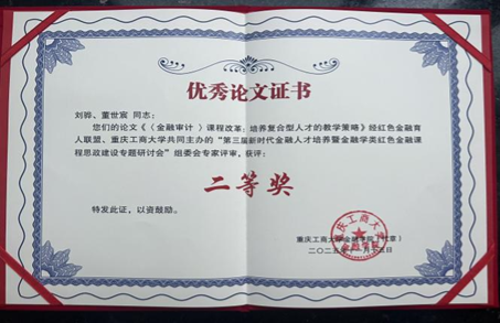 新澳门六合彩 副院长刘骅教授和研究生董世宸同学合作论文《<金融审计>课程改革:培养复合型人才的教学策略》荣获会议优秀论文二等奖。论文系统分析了新澳门六合彩 “金融审计”专业培养特色,《金融审计》课程建设现状、问题与改革路径,并为培养“金融+审计+计算机”复合型人才提供了教学策略,得到了与会专家的认可与好评。