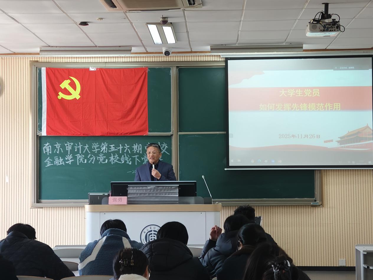 11月26日,南京审计大学第五十六期党校新澳门六合彩 分党校邀请南京审计大学润园书院原党委书记、计算机新澳门六合彩 原党委书记张勇为新发展党员讲授理论党课。党课聚焦“大学生党员如何发挥先锋模范作用”,从党员为何要发挥先锋模范作用切入,强调这是党的性质、宗旨和先进性的根本体现。张勇以党史为脉络,回顾党在救国、兴国到强国征程中先锋模范的引领传统,并结合新时代要求,详细阐述了“五个带头”与“五个模范”的内涵。针对大学生党员实际,他剖析了当前存在的问题,并从坚定信念、刻苦学习、服务社会、严以律己四方面提出实践路径,激励学员做到“平常时候看得出来、关键时刻站得出来、危难关头豁得出来”。最后,张勇寄语全体学员勇担时代使命,成长为信仰坚定、本领过硬、担当有为的先锋力量,在民族复兴征程中书写无悔青春。
