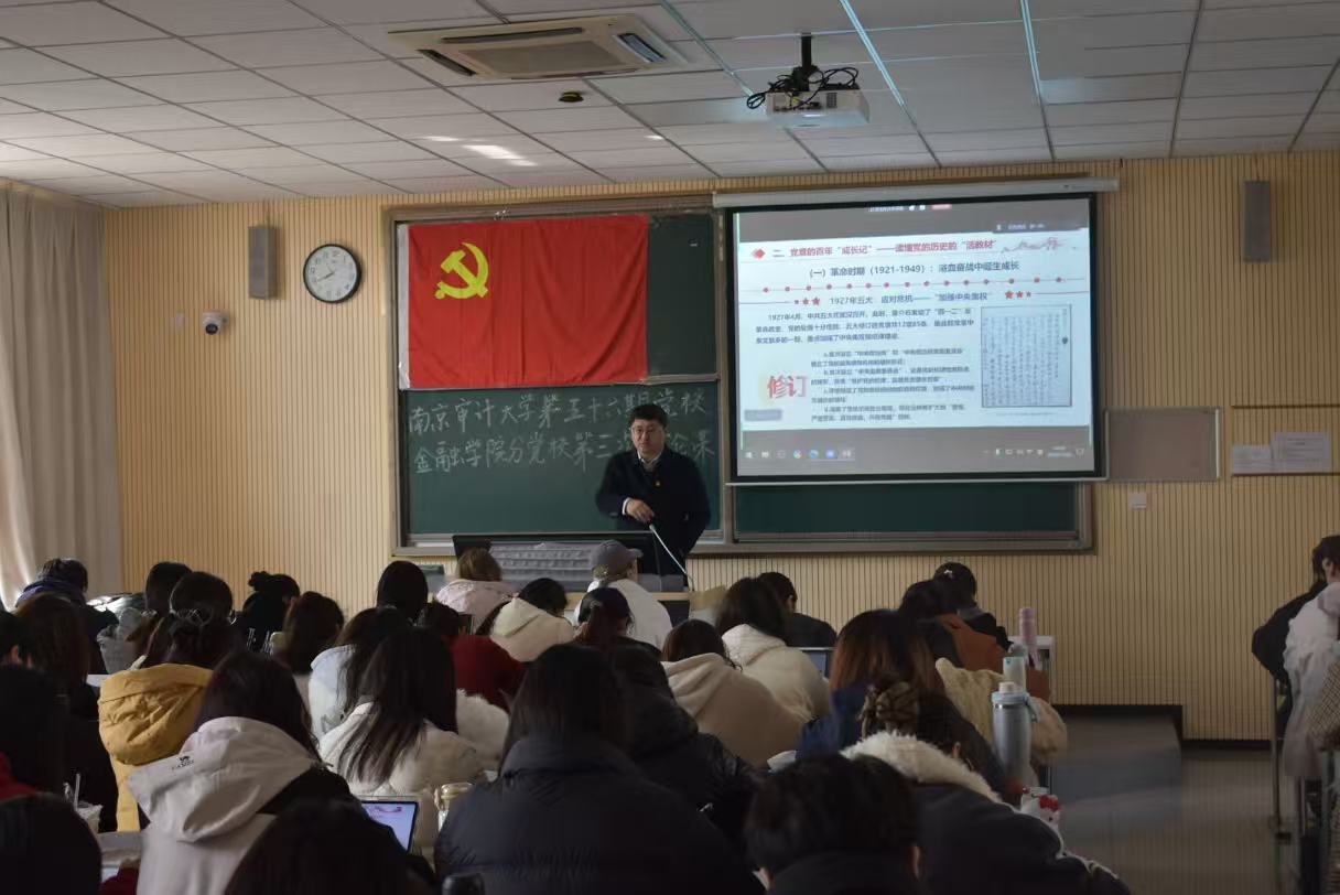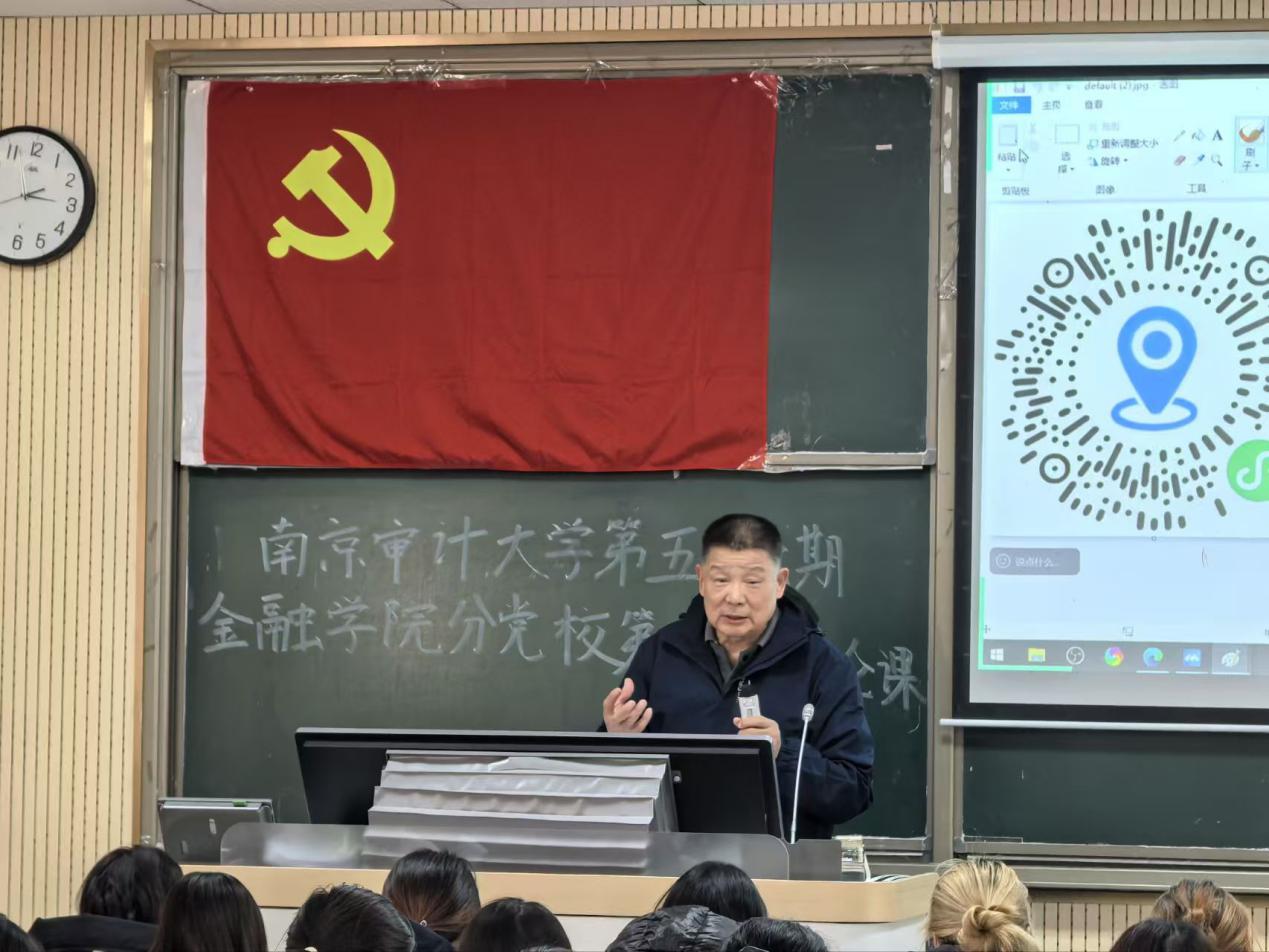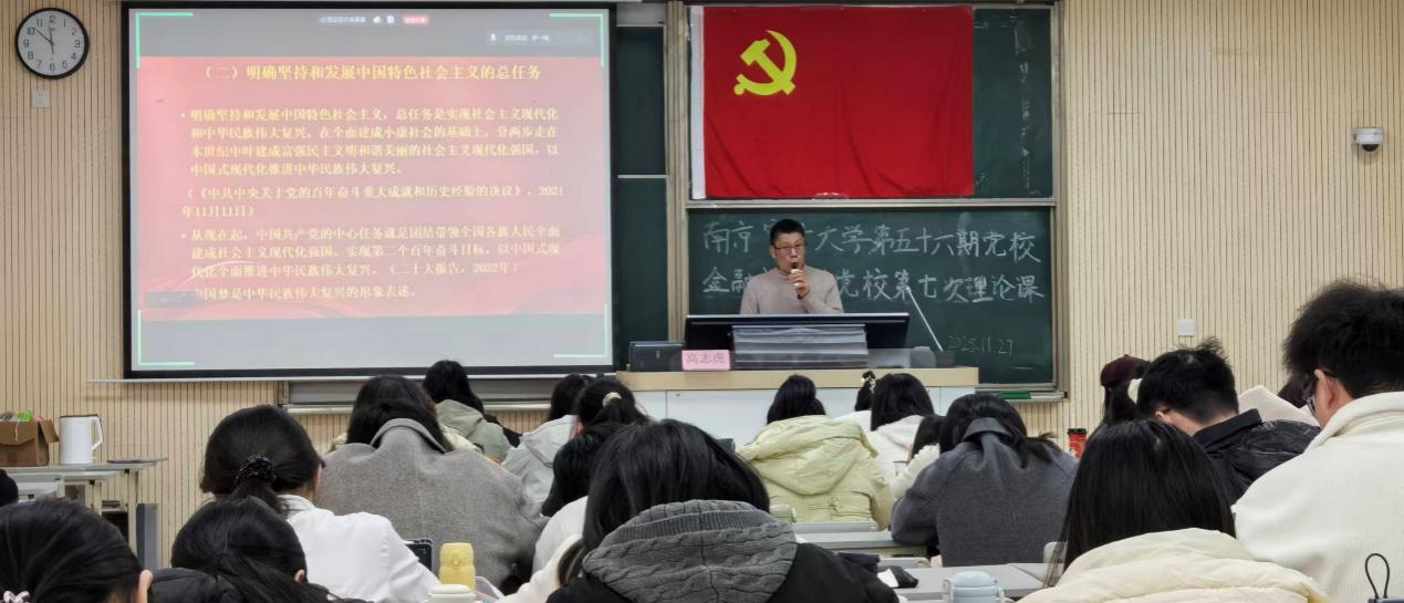 11月27日,本期分党校第七次理论党课于致远楼302顺利开讲。南京审计大学马克思主义新澳门六合彩 教授高志虎以“习近平新时代中国特色社会主义思想”为主题展开授课。高志虎在讲授中系统阐释了中国特色社会主义最本质的特征是中国共产党的领导,深入解读了全党必须增强的“四个意识”、坚定“四个自信”与践行“两个维护”的核心要求。他进一步讲解了“六个必须坚持”所蕴含的世界观和方法论,梳理了新时代十三个方面取得的历史性成就与变革,并围绕全面依法治国、社会主义基本经济制度、新时代强军目标等重大理论命题进行了深入分析。高志虎还结合金融学科特点与青年党员成长实际,引导学员深刻把握中国特色社会主义理论体系的丰富内涵、时代价值与实践指向。