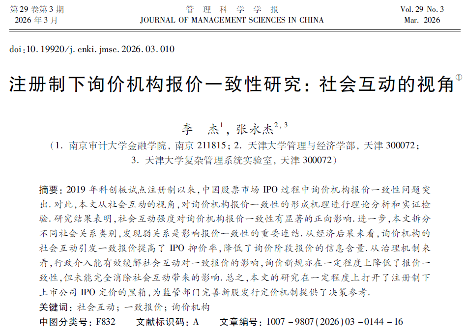 我院李杰副教授与天津大学张永杰教授合作的论文《注册制下询价机构报价一致性研究:社会互动的视角》,发表在A1期刊《管理科学学报》上。