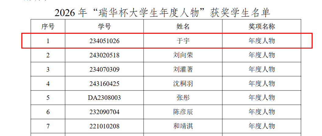捷报传佳音,榜样催奋进。我院本科生于宇、高中霞凭借扎实的专业功底与全面的综合素养,成功获评2026年“瑞华杯大学生年度人物”暨“最美大学生”以及2026年“瑞华杯大学生年度人物”暨“最美大学生”提名奖,谨向两位优秀同学致以最热烈的祝贺!